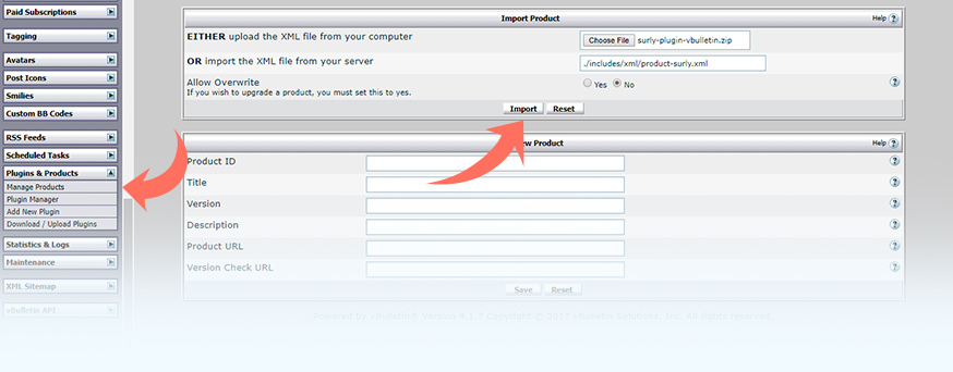 • Go to Plugins & Products → Manage Products. Click Import Product. In the Import Product dialog, enter the path to the XML file: ./includes/xml/product-surly.xml and click Import