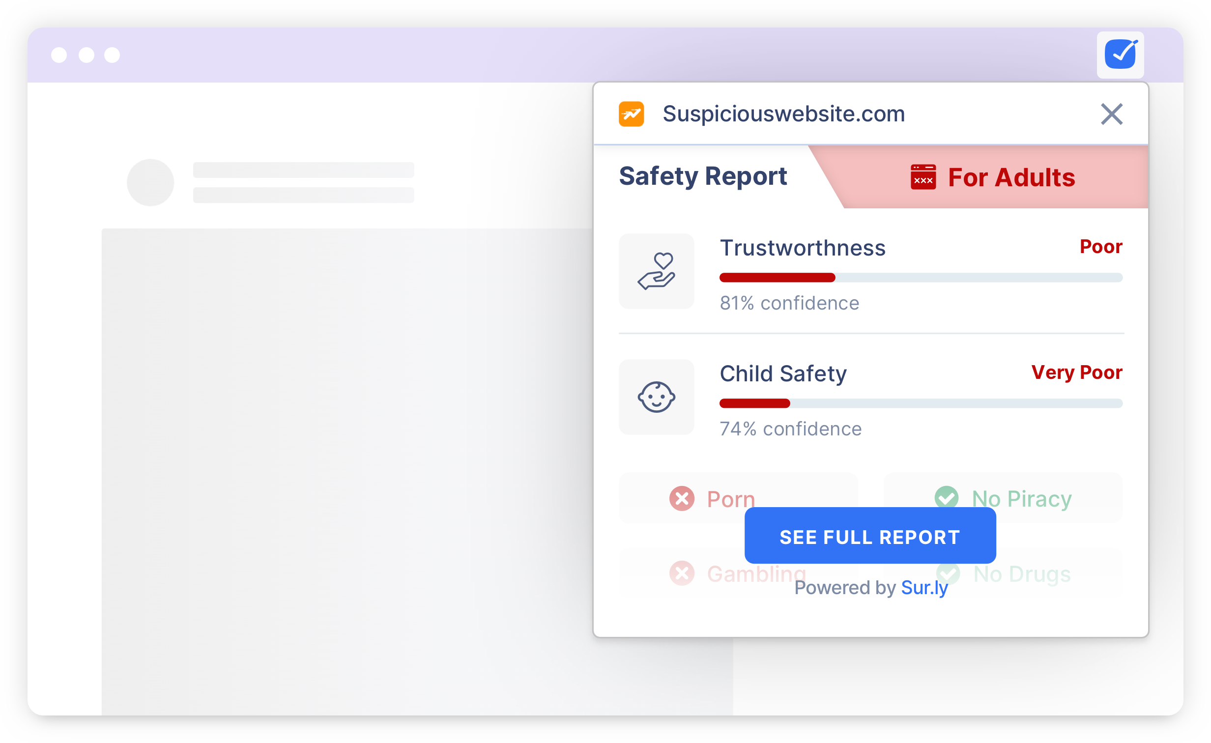 Sur.ly makes its best to protect users from many potential threats on the Web, including malware, scam or phishing pages, unsolicited adult content, etc. That's why Sur.ly Surfguard is connected to our own database of up-to-date web safety profiles: we use only credible public sources along with our comprehensive technology to research, determine, and bring together all vital safety indicators of any website.