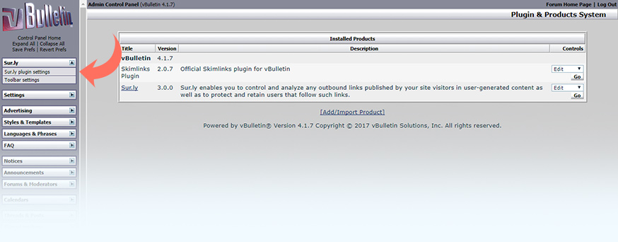 • Go to Plugins & Products → Manage Products. Click Import Product. In the Import Product dialog, enter the path to the XML file: ./includes/xml/product-surly.xml and click Import