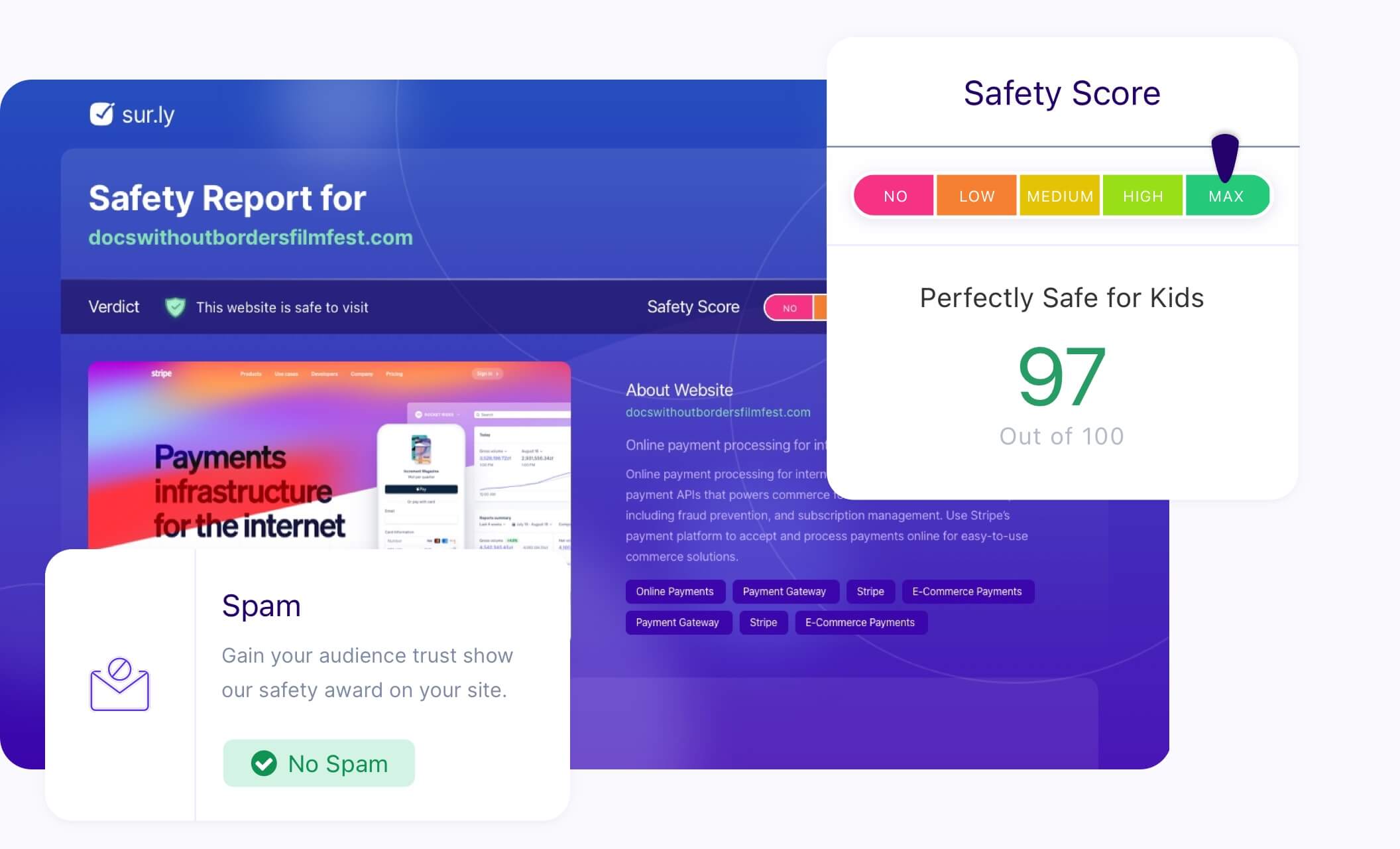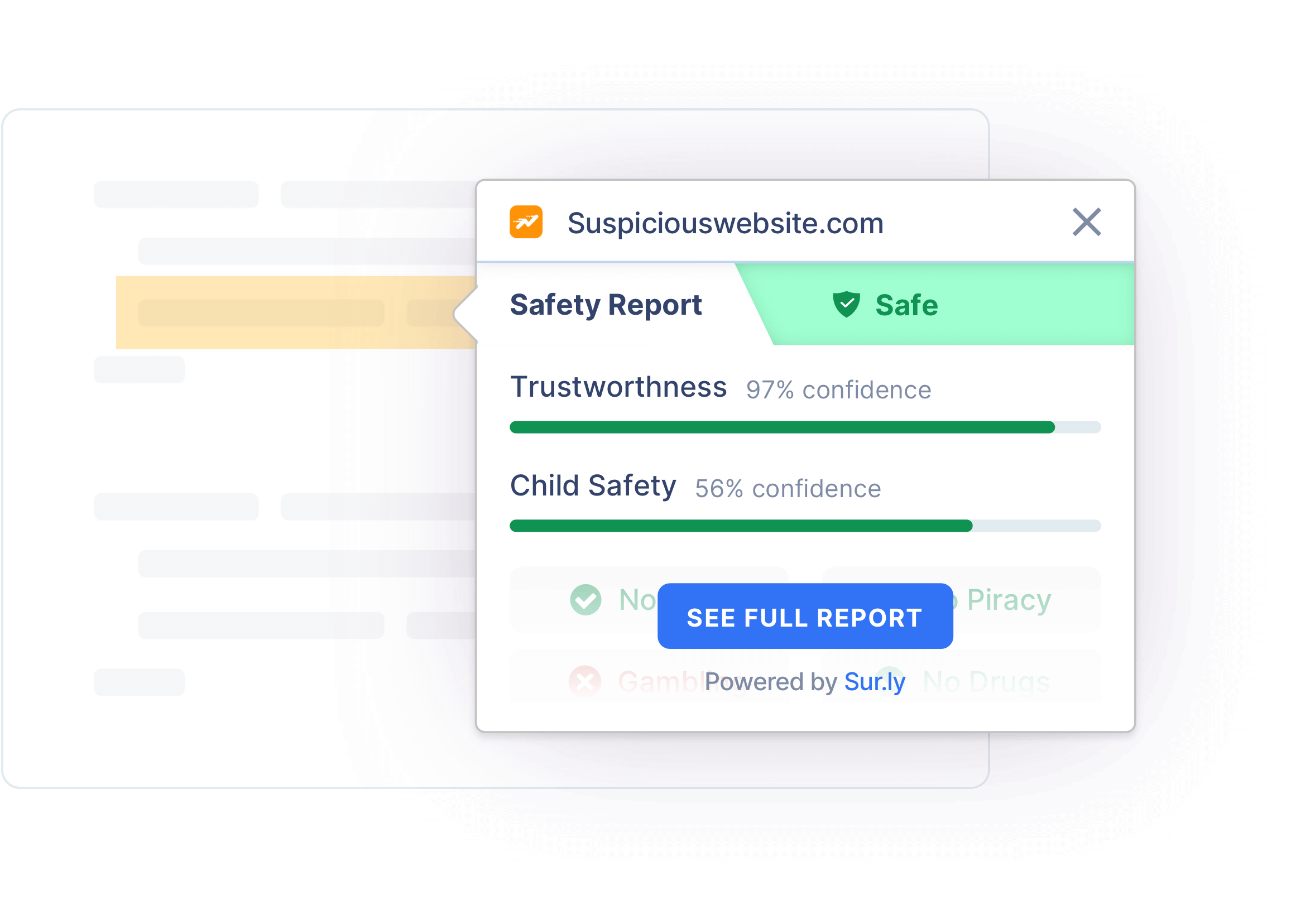 That's why Sur.ly Surfguard is connected to our own database of up-to-date web safety profiles: we use only credible public sources along with our comprehensive technology to research, determine, and bring together all vital safety indicators of any website.